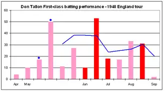 Tallon had had moderate success with his batting during the Test series, aggregating 114 runs at 28.50.[67] He usually batted at No. 8,[22][29][36][51] and only had four innings as Australia's batting strength was such that he did not need to bat in the second innings in any of the Tests.[67] The Australian team strategy of primarily depending on fast bowling saw Tallon make 12 catches and no stumpings during the Tests.[67] However, Bradman gave his lead pace bowlers Miller and Lindwall more rest during the tour games to save energy for the Tests,[68] and relied more heavily on the off spin of Ian Johnson and the leg spin of McCool and Doug Ring in the county matches. Thus overall Tallon took 29 catches and 14 stumpings for the first-class matches during the tour. Tallon scored 283 runs at 25.72 for the season at an average higher than Saggers's 23.22.[69] In all his matches on tour, Tallon conceded 249 byes as Australia conceded 5331 runs, a bye percentage of 4.67%, compared to Saggers's 221 byes from 6190 runs, a percentage of 3.57%.N-[4]