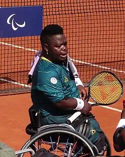 Donald Ramphadi (born 10 June 1993),[3] nicknamed Dona,[3] is a South African wheelchair tennis player who plays in the sport's quad division. Ramphadi, alongside partner Andy Lapthorne, is the 2023 French Open quad wheelchair doubles champion.[4] Ramphadi has also been the runner-up in numerous quad wheelchair doubles grand slam events, with frequent partners including Lapthorne, Lucas Sithole, and Koji Sugeno.[5] Ramphadi and Sithole won bronze in the quad doubles wheelchair tennis event at the Paris 2024 Paralympic Games, which was the African continent's first-ever wheelchair tennis medal.[6]
