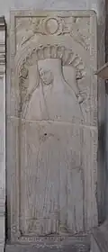 statue in niche with low reliefs | marble, probably at times with lance or sword and helmet (metal) | 204 × 78 × 34 base relief: 39 × 120 |