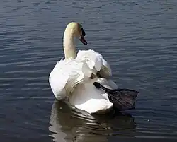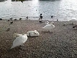 This lake is home to a flock of mute swans which have the gene for leucism.