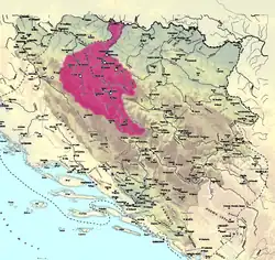 In the 2nd half of the 12th century, the Banate of Bosnia, governed by Ban Borić, a Hungarian vassal, was confined to the regions of central Bosnia.[14] By 1167, the Banate of Bosnia and parts of the Croatian Kingdom were captured by the Byzantine Empire,[15] including the Croatian-Hungarian župas of Pliva, Luka, and Vrbanja,[16][17] where the zemlja of Donji Kraji would later develop.[18][19] With the death of Emperor Manuel I Komnenos in 1180, the Byzantines lost the acquired lands.[15] The area of Donji Kraji was granted to Bosnian Ban Kulin by King Bela III for his assistance in the wars with the Byzantines.[18] Kulin's influence was restricted to the centre of his banate, as the regions to which he expanded have retained de facto independence.[14]