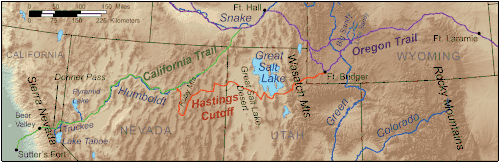 Lansford Hastings, an early migrant from Ohio to the West, published The Emigrants' Guide to Oregon and California to encourage settlers.[9] As an alternative to the Oregon Trail's standard route through Idaho's Snake River Plain, he proposed a more direct route (which actually increased the trip's mileage by 125 miles) to California across the Great Basin, which would take travelers through the Wasatch Range and across the Great Salt Lake Desert.[10] Hastings had not traveled any part of his proposed shortcut until early 1846 on a trip from California to Fort Bridger, a scant supply station run by Jim Bridger at Blacks Fork, Wyoming. Hastings stayed at the fort to persuade travelers to turn south on his route.[9] As of 1846, Hastings was the second person documented to have crossed the southern part of the Great Salt Lake Desert, but neither had been accompanied by wagons.[10][A]