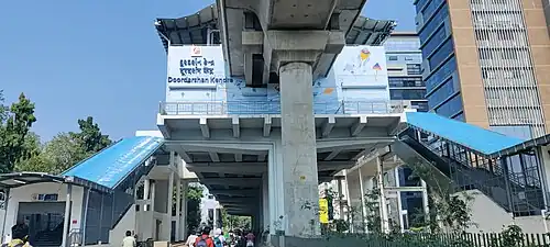 Doordarshan Kendra is an elevated metro station on the East-West Corridor of the Blue Line of Ahmedabad Metro in Ahmedabad, India. This metro station consists of the main Doordarshan Kendra (Ahmedabad) along with its adjacent Ahmedabad Education Society Ground and SKUM College of Physiotherapy. This phase of the metro system was opened to the public on 30 September 2022.[1][2][3][4]