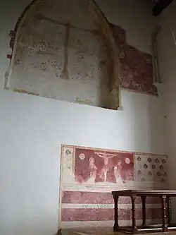 Other fittings include one of the few surviving lead fonts in England, frescoes of 1340 and several monuments, especially the well-known "swaggering knight" effigy formerly believed to be Sir John Holcombe who died in 1270 but it is more likely that it is William de Valence the Younger (died 1282 [2] at the Battle of Llandeilo Fawr), son of William de Valence, 1st Earl of Pembroke.