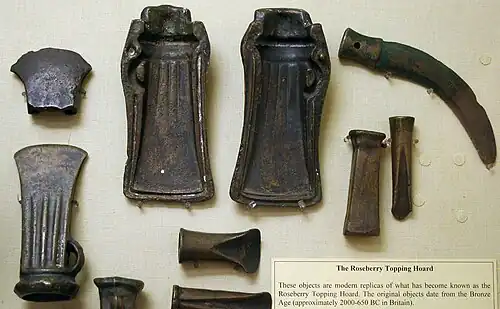 Replicas of the Roseberry Topping Bronze Age hoard, bronze axe- and spear-heads and the mould of a large axe head itself, ideal for making more axes from, are in a display case.