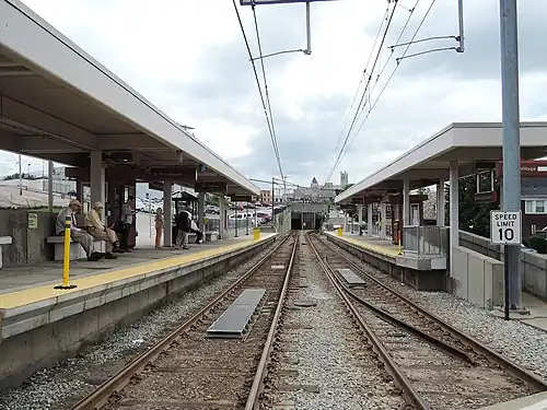 Dormont Junction is a station on the Red Line route of Pittsburgh Regional Transit's light rail network.[2] It is located in Dormont, Pennsylvania. The station is an important park and ride facility, featuring 132 spaces.[3] West Liberty Avenue, Dormont's main artery, is located one block uphill from the station, in a portion of the street that is lined with automobile dealerships. Opposite the commercial sector, a densely populated residential area is located with many homes within walking distance of the station.