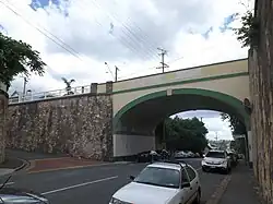 There were two prior bridges known to span Boundary Street. A map of 1895 reveals that an "over bridge" was in existence and in December 1888, the South Brisbane Municipal Council approved a tender by the firm of Walters and Cooper to construct a bridge at this intersection. This late 1880s bridge existed until the current bridge replaced it in 1941. This earlier bridge was known to locals as the "Black Bridge" due to wet tar falling from wagons carrying felled timber. The ends of the timber were washed with tar, and on the journey across the bridge the tar would drip onto the road and subsequently be splashed onto the bridge railings.[1]