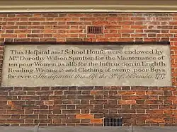 Dorothy Wilson, who died in 1717, left money for the establishment of an almshouse for ten poor women, and a school for twenty poor boys. This was set up in 1719, in her former house, on Walmgate, by the River Foss. The building was replaced in 1765, and rebuilt again in 1812, reusing some materials. In 1810, a schoolmaster's house was built behind the property. The school operated until 1895.[1] In 1958, the building was modified to offer two-room flats, and it continues to operate as an almshouse.[2] The building was grade II listed in 1954.[3] In 2011, the charity operating it merged with the Ellen Wilson Hospital Charity, to form the Ellen and Dorothy Wilson Almshouse Charity.[2]