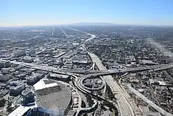 By 1957, the California Division of Highways (now the California Department of Transportation) had accounted for an interchange in planning the construction of the Santa Monica Freeway, with construction of the interchange being included in the freeway's initial segment which started at the East Los Angeles Interchange.[2] Construction work for the initial segment, valued at $8.4 million ($69.7 million in 2023 dollars),[2] began that summer on June 17, 1957,[3] with major grade separation and rerouting work for the interchange, requiring the temporary rerouting of the Harbor Freeway and the diversion of Venice Boulevard, taking place the following year.[4] In common with the East Los Angeles Interchange, which was built in the middle of majority-Hispanic Boyle Heights, the interchange's construction displaced an entire neighborhood — described by the Home Owners' Loan Corporation as being "thoroughly blighted" — primarily inhabited by African Americans, along with smaller numbers of Mexicans, Japanese and Italians.[5]