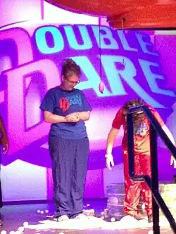 Beginning May 21, 2012, Nickelodeon Suites Resort in Orlando produced Double Dare as a nightly live stage presentation, Double Dare Live.[83] As part of the Studio Nick feature of the hotel, shows were performed each night exclusively for the resort's guests. The show featured elements and updates from the various versions of Double Dare, including remixed music, physical challenges and an obstacle course similar to the TV show. Like the most recent formats of the program, eight contestants were selected to participate for the game-playing teams, while additional audience members played other physical challenges throughout the program. The production continued until Nickelodeon Suites Resort Orlando rebranded as a Holiday Inn Resort on June 1, 2016.[84] A scaled-down version of Double Dare Live, called Double Dare Challenge, has been presented at Nickelodeon Universe in Mall of America in seasonal cycles since 2016.[85][86][87]