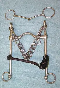 The bradoon always lies higher in the horse's mouth than the curb bit, and is placed above the curb chain. It is common to place the bradoon a bit higher in the mouth than a snaffle used alone, because it is less likely to get caught on the curb.[1] However, it is important that the bits do not lie too far apart from each other within the mouth, as the tongue may be caught between the two.[4] In general, both bits are chosen to be slightly thinner. Although this increases their severity, most horses prefer thinner bits because it allows for more room for the tongue, which can be uncomfortably cramped with two thick bits sharing the space.[1]