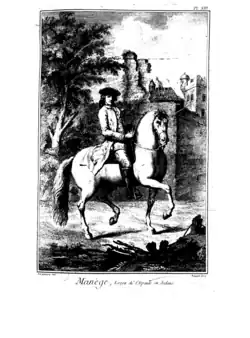 In the 3 to 1 rein hold, one hand (historically, the left hand) holds three reins and the other only one rein. The three-rein hand controls both curb reins and the bradoon rein which belongs to that side, and the other hand simply holds the other bradoon rein and the whip. It is a hold that was common to the classical dressage tradition. Today the 3 to 1 rein hold is used while training, rather than competition, although it is still seen used by the Spanish Riding School.[4]