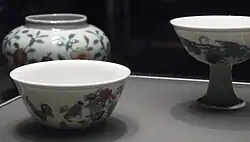 In 2014, the "Meiyintang Chicken Cup", a small doucai wine cup 8.2 cm wide, achieved a world record price for Chinese ceramics, selling at Sotheby's in Hong Kong for 281,240,000HKD (US$36.05 million),[23][24] bought by Liu Yiqian. Later pieces can also fetch high prices.[25]