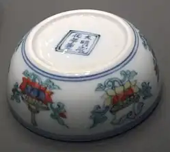 The style began in the 15th century under the Ming dynasty in the imperial factories at Jingdezhen, and its finest products come from a few years in the reign of the Chenghua Emperor, mostly small pieces like the famous Chicken cups.[2] The style was discontinued after a few decades, as a suitable overglaze blue was developed, but later revived under the Qing dynasty. It is not to be confused with the wucai style, which was a related early technique for polychrome painting.[3] Doucai can be translated as "contrasted colours",[4] "fitted colours",[5] "colours which fit together"[6] or "dove-tailed colours".[7]