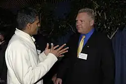 Ford's first involvement in politics came when Doug Holyday approached Deco to print stickers for signs for his 1994 mayoral campaign in Etobicoke. Ford took it upon himself to canvass for Holyday.[20] He then assisted in his father's campaigns as a PC MPP candidate in 1995 and 1999.[21] He also ran his brother Rob's council campaigns in 2000, 2003, and 2006, and Rob's winning mayoral campaign in 2010.[9]