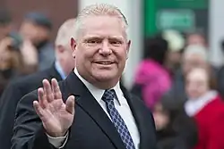 Douglas Robert Ford Jr. ECO MPP (born November 20, 1964) is a Canadian politician and businessman who has served as the 26th and current premier of Ontario and leader of the Progressive Conservative Party since 2018. He represents the Toronto riding of Etobicoke North in the Legislative Assembly of Ontario.