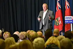 In March 2018, the Liberals tabled a pre-election budget in the provincial legislature which promised billions of dollars in new spending for free childcare and expanded coverage for dental care but replaced the government's previous balanced budget with a $6.7 billion deficit projected to last until 2024–2025.[65] Ford called the budget a "spending spree".[66] He said he would condense the Conservative platform adopted under former leader Patrick Brown, reducing "about ten percent of [it]",[67] into a five-point plan focusing on health, education, creating jobs, getting rid of the province's cap and trade program for carbon emissions, and reducing electricity rates.[68][69][70]