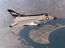 The F5D Skylancer was derived from the F4D and intended to be a Mach 2 capable successor to the Skyray. Although four prototypes were built and flown, the project was cancelled as being too similar in mission parameters to the F8U Crusader and also to reduce dependence upon Douglas Aircraft, which was also producing several other aircraft for the U.S. Navy.[19][20] This decision effectively removed Douglas from active fighter development.[21]