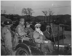 Summerall nominated MacArthur for the Medal of Honor and promotion to major general, but he received neither.[69] Instead, he was awarded a second Distinguished Service Cross.[70] The 42nd Division returned to the line for the last time on the night of 4–5 November 1918.[71] In the final advance on Sedan. MacArthur later wrote that this operation "narrowly missed being one of the great tragedies of American history".[72] An order to disregard unit boundaries led to units crossing into each other's zones. In the resulting chaos, MacArthur was taken prisoner by men of the 1st Division, who mistook him for a German general.[73] This would be soon resolved by the removal of his hat and long scarf that he wore.[74] His performance in the attack on the Meuse heights led to his being awarded a seventh Silver Star. On 10 November, a day before the armistice with Germany that ended the fighting, MacArthur was appointed commander of the 42nd Division, upon the recommendation of its outgoing commander, Menoher, who had left to take over the newly activated VI Corps.[75][76] For his service as the 42nd's chief of staff and commander of the 84th Infantry Brigade, he was later awarded the Army Distinguished Service Medal.[77]