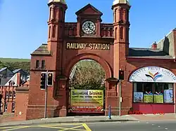 The main entrance to the station is via a grand archway at the junction of Peel Road and Athol Street. This has two gilt-topped turrets and clock tower, between which are a set of steps descending to the station. These gates are usually closed, but there is a smaller gate on the left side of the structure which provides pedestrian access from Athol Street and the financial district. A second entrance at the bottom of the hill from North Quay provides level/vehicular access to the station.