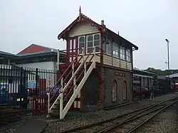 Built in 1892 and located at the station throat between the carriage shed and the workshops. The Points Box, as it was called locally, contained a 36-lever frame signal box was built by Dutton & Co., of Worcester, and supplied to the railway when the yard was further modified and the workshops were extended. The frame is a unique survivor of the 'drink-handle' type in which the handle of the lever also serves as the catch handle. The 'box features a set of characteristic wooden external steps that must be climbed to access the levers, with storage space beneath the timber-built top section, this would have housed all the linkage and control gear.