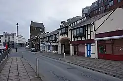 The station is sited on an area known as Lake Road (although technically this was lost during the more recent developments), so-called because the area was, until the arrival of the railway, swampland that was reclaimed to build the station other developments. The river now runs along the southerly side of the site. Where now stands the chain store was once a large timber yard operated for many years by Quiggin & Co., and this backed onto the railway's property. What now forms both car and bus parking areas was once the railway's large goods yard, and there was also another island platform which was removed in 1979 to make way for bus storage area.e Further up the yard towards its mouth are the sheds which are original. At the approach to the station is the junction of Bank Hill which runs alongside the station perimeter wall, now an office development dominates this site but it was until 1988 home to one of the island's smaller breweries. In recent times the north quay the adjoins the site has been partially pedestrianised and now has a number of restaurants and public houses as well as a selection of shops and boutiques. The large red brick office block that sits behind the station was erected in 1988 on the site of the former Clinch's Brewery, the tower of which was retained in the new development. The site is in the central part of the island's capital close to the financial district making it ideally suited for the commuter train services which since 2007 have been provided annually during the T.T. race period. Its location at the end of the inner harbour was ideal in the past when the railway carried cargo directly from ships that berthed nearby.
