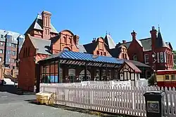 By the mid-1880s it was clear that rail traffic had outgrown the modest original station, and that rebuilding was necessary. This commenced in 1887 with the construction of Offices, refreshment room and bar, and a new ladies' waiting room on the site of an old warehouse in the south east corner of the site. This was followed by a new booking hall and platforms (1891/2), a signal box (1892); a new carriage shed (1893); new workshop, locomotive shed, and carpenters' shop (1892–96); men's lavatory (1904); platform canopies (1909), and stables c.1913. This station remained largely intact until 1979 when the station was rationalized. The station, together with gateway and other structures, was listed on the Isle of Man's Registered Buildings in 1984.[1]