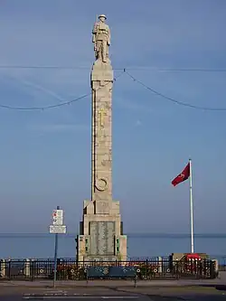 The memorial, including the statue at top, stands about 50 feet (15 m) high and has a stone base rising in four steps, upon which is a tall column of Manx granite, surmounted by the three ton figure of a soldier called "The Manxman".[1] It was designed to have a flower garden and guard rail surrounding it and stands on what was once a bandstand area.[2] The front facade features sculptures of a wreath and holy cross. Rolls of names and copper vases for flowers are affixed to the base.
