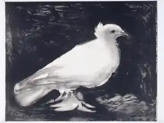 Dove (French: La Colombe) is a 1949 lithograph on paper created by Pablo Picasso in 1949 in an edition of 50+5. The lithograph displays a white dove on a black background, which is widely considered to be a symbol of peace. The image was used to illustrate a poster at the 1949 Paris Peace Congress and also became an iconographic image of the period, known as "The dove of peace". An example is housed in the collection of the Tate Gallery and MOMA. Since then, it has been considered a masterpiece.