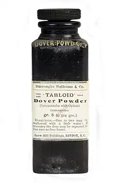 - ^ The Extra Pharmacopoeia Martindale. Vol. 1, 24th edition. London: The Pharmaceutical Press, 1958, page 812. This reference also cites "Tablets of Ipecacuanha and Opium (B.P., Ind. P.) Tab. Ipecac. et Opii (B.N.F.), Dover's Powder Tablets. Unless otherwise specified tablets each containing 5 grains of powder of ipecacuanha and opium are supplied."
