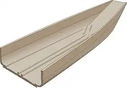 The boat was constructed of oak planks, stitched together with yew withies and also fixed together with wooden wedges driven into cleats carved from the planks.[9] This makes it similar to the Ferriby boats, which are also stitched planks. It is, however, quite different from the Must Farm dugouts, which are not only dug out of one trunk, but the smaller, lightweight ones are made of lighter linden trunks.[10]