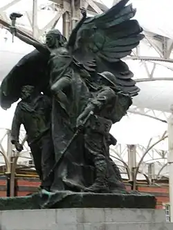 Standing on a granite plinth is a group of four figures cast in bronze, a sailor, a soldier, a bugler to the rear and rising above and between them the winged "Victory", a woman, holding aloft the "torch of truth".[1] The memorial also consists of a wall inscribed with the names of those who fell in World War I. Those remembered are the 556 men of the South Eastern and Chatham Railway killed in the Great War and 626 men of the Southern Railway who died fighting in World War II.[1]