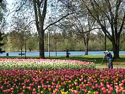 In May, the surrounding park, Commissioners Park, displays tulips planted by the National Capital Commission (NCC) for the annual Canadian Tulip Festival. More than 50 varieties and approximately 300,000 tulips bloom each May along the Rideau Canal. Each year, the Dutch royal family sends 10,000 tulips to Ottawa, as thanks for the city's support during the Second World War. [4]