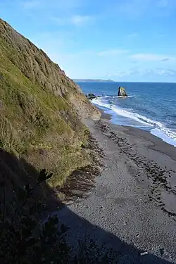 Past Coleadon is a 600 metres (660 yd) stretch of beach which ends in a rocky outcrop known locally as "Shag Rock" after the seabirds who can be seen sitting on the rock drying their wings after diving for fish. This marks the end of easy foot access to the coastline. There is a path up the cliff which leads to the road above this beach, the climb is pleasant but reasonably strenuous. The ruins of an old Victorian lodge, known as "St Germans Hut", can be found halfway up this cliff path.