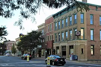 The district contains 78 contributing buildings centered on the city's "four corners" formed at the intersection of Main and Fulton Streets, but also included properties on Church, Fremont, Spring and Prospect Streets. It encompasses the historic commercial district. Within the district boundaries, 79 percent of the buildings are commercial, eight percent religious, five percent residential, and the remaining service and educational. They range in age from pre-1850 to 1977, and are architecturally significant from pre-1850 to 1931. The majority were built 1870 to 1900, and include a variety of popular architectural styles, including Neoclassical, Renaissance Revival, Romanesque Revival, Second Empire, and Art Deco. The predominant commercial building style is Italianate and is a three-story brick structure with projecting, bracketed cornices and details.[3][2]