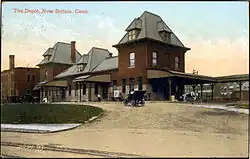 The Hartford and New Haven Railroad (H&NH) opened through the far east part of New Britain in 1839.[3] The railroad quickly established a New Britain station on what is now New Britain Avenue (CT-174) just over the Wethersfield border, possibly in a privately owned building or house.[4] It was replaced with a dedicated station at the same location in 1848.[4]
