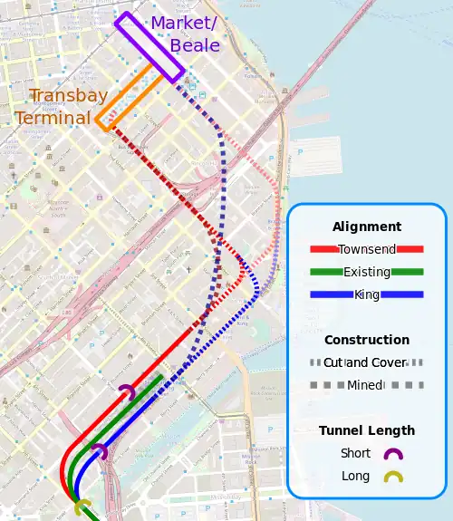 | Cut and cover | Turns north after 2nd/King | Turns north at Beale/Embarcadero | |||