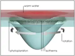 Meso- (>10-100's km) and submesoscale (<1-10 km) eddies are ubiquitous features of the upper ocean. Eddies have either a cyclonic (cold-core) or anticyclonic (warm-core) rotation. Warm-core eddies are characterized by anticyclonic rotation that directs surface waters inward, creating high sea surface temperature and height.[7] The high central hydrostatic pressure maintained by this rotation causes the downwelling of water and the depression of isopycnals - surfaces of constant density (see Eddy pumping) at scales of hundreds of meters per year.[8] The typical result is a deeper surface layer of warm water often characterized by low primary production.[9][10]