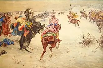 On 6 September, the corps participated in the Storming of Lemberg (Lviv) in which Drabant Jöran Silfverhielm personally captured the garrison commander, Franciszek Gałecki, hiding in a Jesuit monastery.[117][118] The Drabants then witnessed the Polish surprise attack on the Swedish camp outside the town. When the king received news of Arvid Horn's surrender at Warsaw,[m][120] he marched back to expel the Saxons from Poland. When the Swedish army crossed the Vistula by the end of October, the enemies fled Warsaw. Many were captured in the pursuit.[121] At one occasion, three Drabants disarmed and captured 21 Russians and Saxons.[122] The Drabants, unable to catch up with the king, instead marched with Otto Vellingk's army. On 1 November, they encountered 300 cavalries in a rearguard, killing most of them while capturing a major and 60 soldiers.[123] Vellingk, along with his five regiments (including the Drabants), arrived at Poniec the day after the battle and then marched to Tillendorf.[124][125] There, on 8 November, they intercepted 600–700 Russians in a wagon fort; the Russian force was annihilated after a brave defence—five were captured and the rest killed,[126] against 21 killed and 50 wounded Swedes. By the end of the month, Charles and the Drabants went into cantonment around Rawicz.[127]