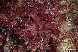 Drachiella is a genus of marine red alga.[2] It has scaly thickenings; also "rhizoids fringing openings".[3] It is found below the kelp zone in areas exposed to moderate wave action; it is iridescent, and consists of a short, narrow stipe broadening into midribless thalli which reach 7 cm in length.[4] Drachiella exhibits diffuse intercalary and marginal growth, and rhizoids are common along the margins, which it uses for anchorage.[2] Pit connections often link adjoining cells.[2]