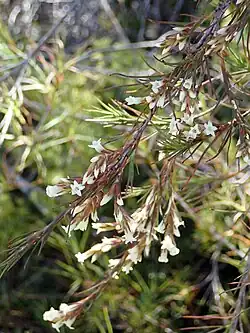 D. ophioliticum grows into a decumbent shrub between 30 and 100 cm tall, though can reach 200 cm in shade, with grey and slightly fissured bark. Its leaves concentrate at the end of branches, and are sheathed in waxy light green leaf sheaths. Enclosed in the sheaths are 2–50 by 1–2.5 mm leaves which are very finely serrate, with 10–13 teeth every cm. The leaves also have tiny warts, are slightly concave shaped, and leathery, with a waxy powder covering them.[2][3]