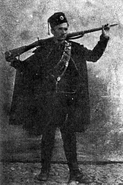 As a graduate of Zajecar gymnasium, Stojadinović contacted fellow countrymen in Belgrade, members of the University Association of Bloodbrothers who recruited young people to liberate the Christian population in Old Serbia, then under Ottoman occupation. At the age of 19 in the spring of 1905, he left with voivode Doksim Mihailović to cross the Ottoman-occupied border and participated in the Fight on Čelopek. After this fight, he continued as a freedom-fighter in the Kumanovo area under the command of Đorđe Skopljanče and later in the Veles and Prilep region under the voivodes Rade Radivojević, Jovan Babunski and Vasilije Trbić until 1908. In the skirmish with Bulgarians in the village of Drenovo near Makedonski Brod[6] on 14 June 1907, he shot the rifle off the hands of VMRO voivode Stefan Dimitrov. After 1908 he enrolled in law school studies, which he completed in good time. In 1911, as a famed crack shot, he was chosen by the French rifle club l'Union des Tireurs Serbes in Belgrade to participate in a European rifle shooting competition in Rome where he took first prize. He defended the title until 1914. In the wars of 1912 up until 1918, he participated as a reserve officer in the 13th Hajduk Veljko Infantry Regiment. During the Balkan wars, he became more involved in recording the bellicose events as a photographer and cinematographer. After the war, he published a photo album of photographs from the Balkan wars and the Arnaut rebellion. By order of the Supreme Command in 1916, he became head of the Cinematographic Section of the Supreme Command of the Serbian Army. Many important war events were recorded due to the outstanding organization of Serbian war photographers and cameramen who were under his watch. After the war, he still continued to record important happenings and events.[7][8]
