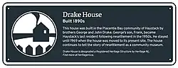 Drake House was constructed in the 1890s in the community of Haystack, Placentia Bay. It was constructed by George Drake and his brother John. Frank Drake, George's son, inherited the property and lived in the building all his life. When Haystack was resettled Frank Drake refused to move, and remained in the house at Haystack for an additional 12 years. In 1969 the house was floated by barge from Haystack to its present site in Arnold's Cove. Frank Drake died in 2002, and was buried at Haystack.[1]