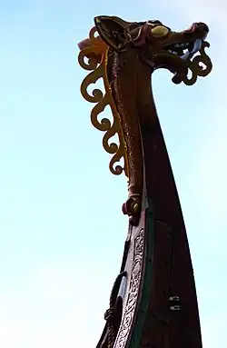 Copies of Viking ships are usually based on interpretations of archaeological material, but in the construction of Draken Harald Hårfagre an alternative method was used. It was decided to begin with the living tradition of Norwegian boatbuilding, with roots that can be traced directly to the Viking Age.[4][5] The foremost Norwegian traditional boat builders are involved in the project.[6] Their knowledge of traditional boatbuilding is supplemented with the results of investigations carried out on archaeological material, source material in Old Norse literature, literature from the same period from foreign sources, iconographic material, etc. The goal of the project is to recreate in this manner an oceangoing warship of 50 oars taken right out of the Norse sagas.