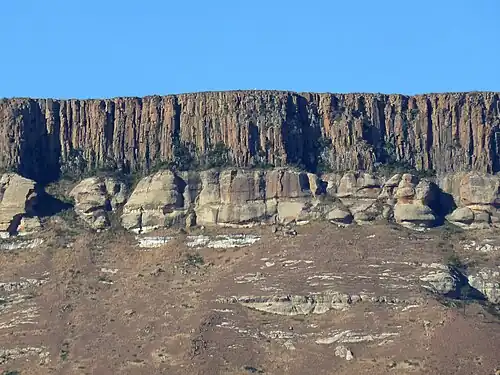 The Drakensberg Group was formed approximately 182 million years ago during the early Jurassic period.[2] Rifting tectonics in response to the breakup of the supercontinent Gondwana are believed to have been the cause for the formation of the Drakensberg Group.[3] Networks of hyperbyssal (shallow intrusives) dikes and sills represent the conduits through the crust that brought basaltic and andesitic lava to the surface, and caused the formation of the extrusive flood basalts of the Drakensberg Group.[4] The dikes and sills are preserved throughout the Karoo Basin, and have served as a weathering barrier for much of the Karoo Supergroup rocks.[5][6]