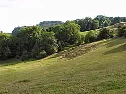 Dream Cave formed as a natural karstic cavity along a vein of mineralisation within a series of Lower Carboniferous limestone rocks called the Monsal Dale Formation.[3] The entrance to Dream Cave (known to cavers as Dream Hole) is on a grass-covered mound, on a hillside to the west of the town of Wirksworth, east of Carsington Reservoir, and overlooking woodland. This entrance is a deep and steep-sided natural fissure within the limestone, and is in fields pockmarked by former lead-mining activity.[1][2] Dream Cave lies at an altitude of approximately 240 metres (790 ft) and is about 15 metres (49 ft) deep,[1] with cavities running in a west-north-west to east-south-easterly direction. Although originally completely infilled with loose material, almost all has since been removed, and what little remains is so disturbed that it shows none of the original stratigraphy.[3]: 110