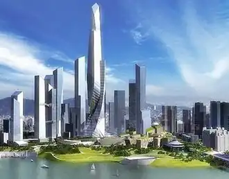![]() Skyline of Dreamhub, with the 665 m Dream Tower at the center. | |