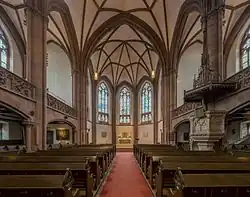 Denzinger designed the church in Gothic revival style, the first and last major church in Frankfurt in that style.[5] The main entrance of the church in the west tower is reached from a small square. The high tower on a square floor dominates the skyline.[6] It was planned to correspond to the Cathedral tower and was at 80 m (260 ft) the second-highest building in the city at the time.[5] The nave extends over five bays. Three front bays are lined by side aisles with sandstone balconies. The choir is a polygon.[6] Denzinger took elements such as net vaulting of the nave, the pulpit, and filigree tracery from late-Gothic style, while round pillars belong to an earlier style. The interior features remnants of the Baroque period of the older church.[1] The church seats 840 people.[5]