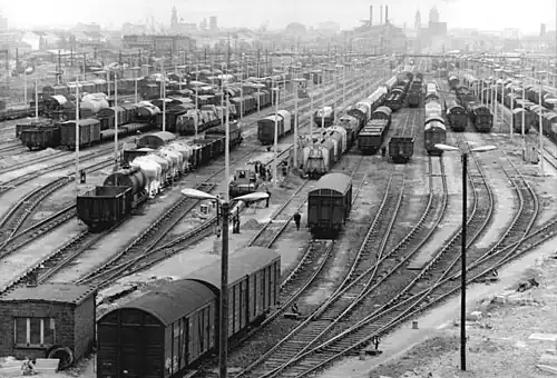 The Berliner Bahnhof, that is the terminus on the line from Berlin, was opened on the site in 1875. A marshalling yard was built from 1890 as a gravity yard, along with a repair shop (Ausbesserungswerk)—which was called the Reichsbahnausbesserungswerk Dresden from 1920—and the locomotive depot. After major destruction as a result of the air raids on Dresden during the Second World War, rebuilding began in 1945. By the turn of the century, its significance had diminished. Until the end of hump operations[3] in 2009, it was along with the Leipzig-Engelsdorf marshalling yard, the only remaining yard in Saxony to handle wagonload freight. After the turn of the millennium, it was redeveloped as a yard for the transhipment of combined transport.