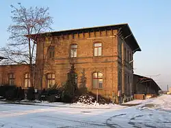 The freight facilities of the Berliner Bahnhof extended for over 1000 metres. This large area allowed the building of the marshalling yard in the 20th century. Five dead-end tracks, a loading ramp and a transfer crane were used to transport livestock and commodities and four dead-end tracks with two external goods sheds handled general freight traffic. The goods sheds, with large attached freight-handling areas on their eastern side, are still preserved. Between the freight-handling buildings there was a traverser for transferring locomotives between the four tracks. Four wagon turntables linked the tracks to the entrance track.[6] Locomotive maintenance facilities, consisting of a twelve-stall locomotive shed, a watering point and a coal loader were located at the western station exit.[6] The Berliner Bahnhof was already important for freight traffic in the early years. This was a result in particular of the fact that the city council had declared the district of Friedrichstadt to be a factory district in 1878. As a result, important industrial companies, such as the sewing machine manufacturer, Seidel & Naumann, the Dresden flour mill, the Yenidze cigarette factory and the municipal slaughterhouse gradually settled there.[7]